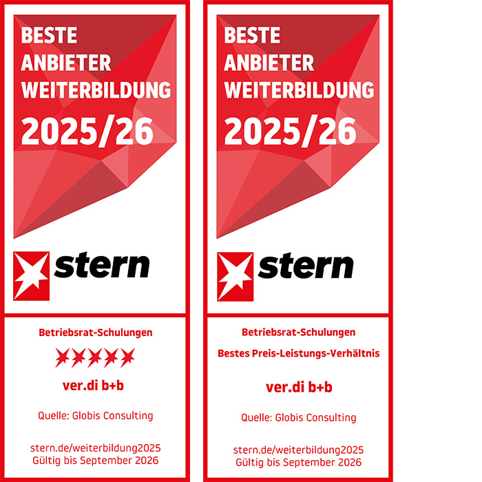 Das Nachrichtenmagazin „stern“ hat in Zusammenarbeit mit dem Analyse-Institut Globis Consulting auch in diesem Jahr wieder eine umfassende Studie zu den besten Weiterbildungsanbietern 2025/2026 durchgeführt. Diese Studie, an der 4.000 Arbeitnehmer*innen teilnahmen, hat in der Kategorie „Betriebsrats-Schulungen“ für ver.di b+b ein hervorragendes Ergebnis erbracht.